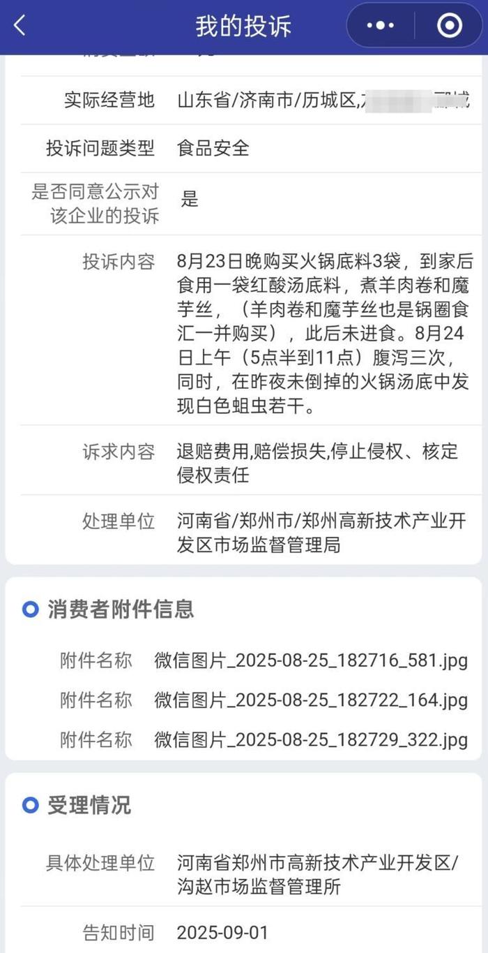 张密斯告诉红星旧事,考虑到锅圈的食材都是由总部同一供应,她没有找店肆,而是间接通过锅圈总部的客服电线日,锅圈客服暗示能够全额退款,被其。8月26日,客服称考虑到消费感触感染,能够正在订单退款之外,再额外申请100元弥补,张密斯暗示无法接管。张密斯还提到,锅圈的客服一曲强调能否是正在晚上吃暖锅时发觉的虫子。她确实吃的时候没有留意,由于“没有人吃暖锅的时候会盯着汤底看”。即便第二天发觉蛆虫的时候,距离打开包拆也不到12个小时。张密斯还向郑州锅圈食汇收集科技无限公司所正在地的市场监管部分进行了赞扬。消息显示,郑州市高新区市场监管局沟赵市场监管所9月1日受理了该赞扬。