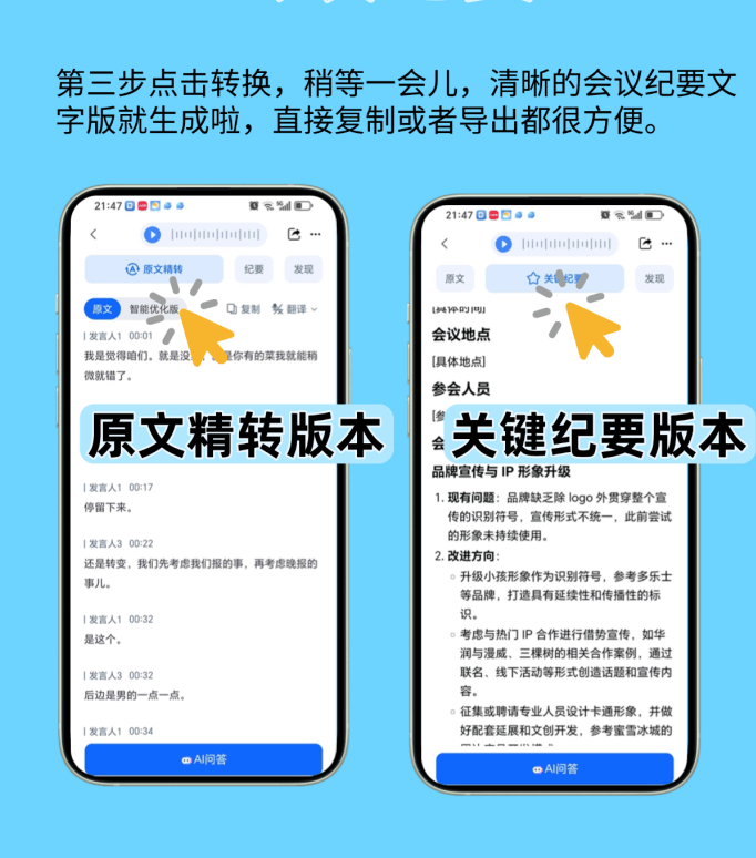 现正在我用它的流程出格顺:先传录音,选“会议纪要”模式,等个几分钟(视录音长度),就能拿到带措辞人标注的 transcript、摘要和环节词。我会先看摘要,有没有漏掉新整改办法,如果没写,间接去 transcript 里找对应的措辞人部门,快得很。然后把环节词拾掇一下,好比“原料农残”“出产流程优化”,这些都是纪要要凸起的。最初查抄术语,确认没问题,一份完整的纪要就搞定了。结果是实的较着!伴侣他们之前拾掇一次纪要要俩⼈一天,现正在一小我俩小时就够,时间省了75%不说,错误率还降了九成。好比前次会议有个从管说“冷链运输要加测温度记实”,之前人工转成“冷鲜运输”,仍是带领查抄才发觉;用听脑AI间接标对了“冷链运输”,压根不消回头改。还有一次会议俩小时,人工拾掇得翻三遍录音,用它十分钟就出了摘要,沉点全正在里面,伴侣说现正在再也不消熬夜赶纪要了。